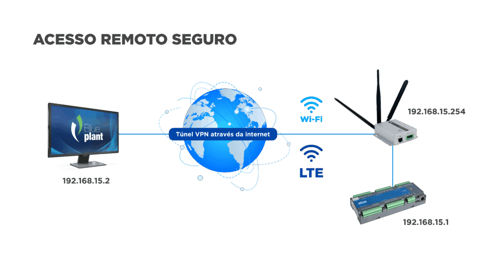 - – Interfaces físicas: o equipamento conta com uma porta Ethernet de 10/100Mbps para conectividade LAN, uma interface serial RS-232/RS-485 para integrar dispositivos Modbus legados, e um módulo WAN celular 4G para conectividade remota sem limites geográficos.