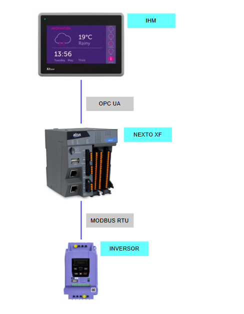 Para fabricantes de máquinas OEM: essa arquitetura representa uma solução típica de máquinas OEM, como envasadoras e embaladoras. A IHM permite ao operador interagir com a máquina, ajustando parâmetros e visualizando o processo, comunicando-se com o CLP Nexto XF via OPC UA, o que garante padronização e facilidade de integração. O CLP atua como o cérebro da aplicação, executando a lógica de controle, gerenciando intertravamentos e coordenando os dispositivos de campo. Já o inversor de frequência, conectado via Modbus RTU, realiza o acionamento do motor com controle de velocidade e torque.