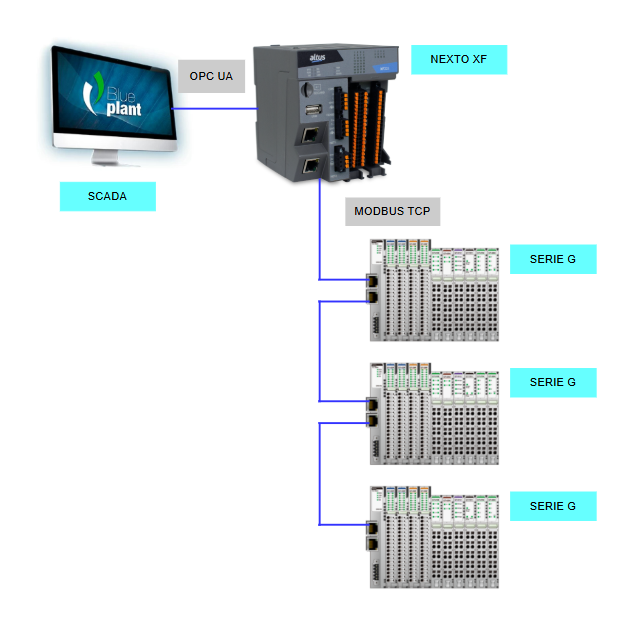 Para o setor de saneamento: essa arquitetura representa uma aplicação típica de saneamento, onde há a integração entre supervisão e aquisição distribuída de dados em campo. O sistema SCADA (BluePlant) realiza o monitoramento e controle global da operação, comunicando-se com o CLP Nexto XF via OPC UA. O CLP atua como concentrador e controlador da planta, executando a lógica de processo e agregando dados de múltiplos pontos remotos. Já os módulos de I/O distribuído da Série G, conectados via Modbus TCP, permitem a coleta e atuação diretamente em campo, reduzindo cabeamento e aumentando a escalabilidade do sistema. Essa arquitetura é ideal para aplicações de saneamento por permitir a expansão modular, fácil manutenção e supervisão centralizada de grandes áreas com múltiplos pontos de controle.