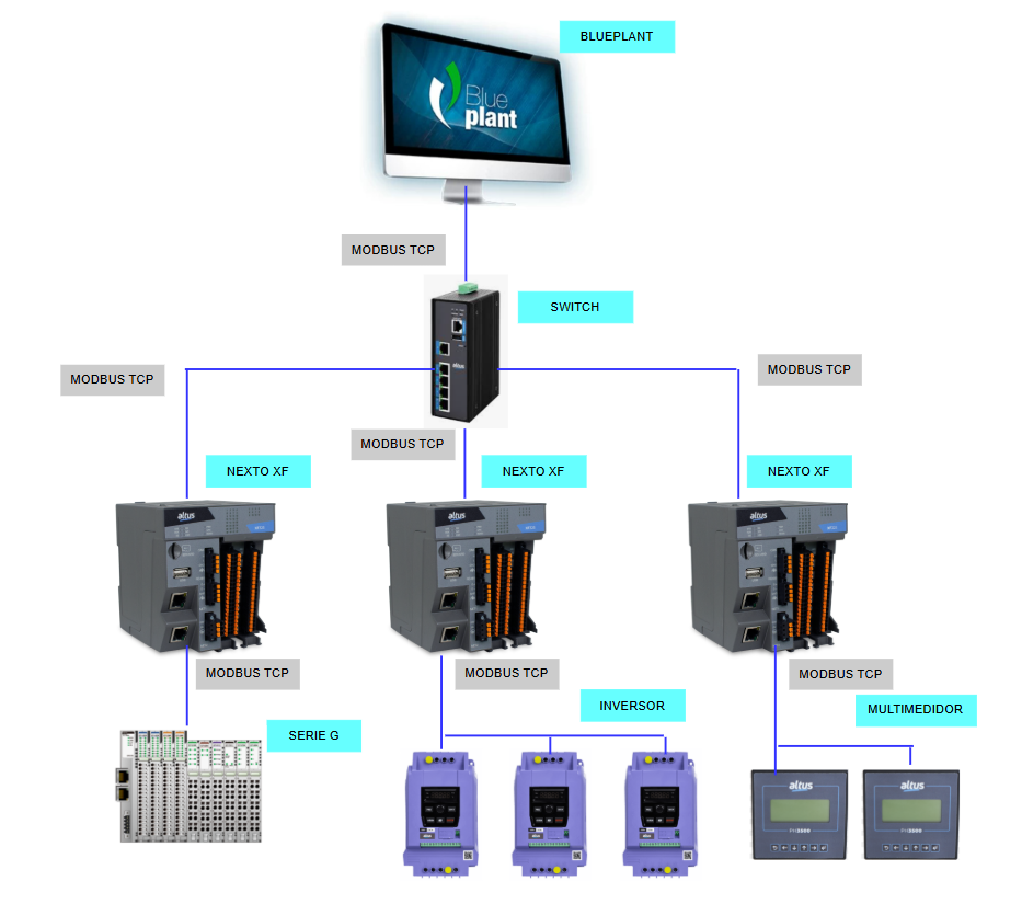 Para indústrias: essa arquitetura representa um cenário industrial mais completo e distribuído, onde há múltiplos níveis de controle e integração em rede. O sistema supervisório BluePlant atua como camada central de operação, comunicando-se via Modbus TCP através de um switch industrial, que organiza e distribui a comunicação entre os diversos CLPs Nexto XF. Cada CLP é responsável por uma parte do processo, executando a lógica local e controlando dispositivos de campo, como inversores de frequência e multimedidores. Além disso, módulos de I/O distribuído da Série G permitem a expansão dos pontos de entrada e saída de forma descentralizada. Essa arquitetura é típica de plantas industriais por oferecer escalabilidade, segmentação de controle, facilidade de manutenção e alta integração.