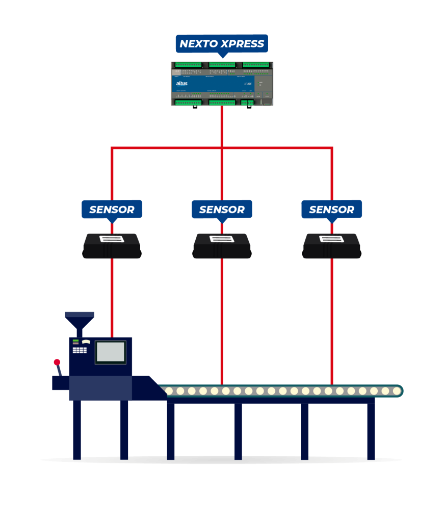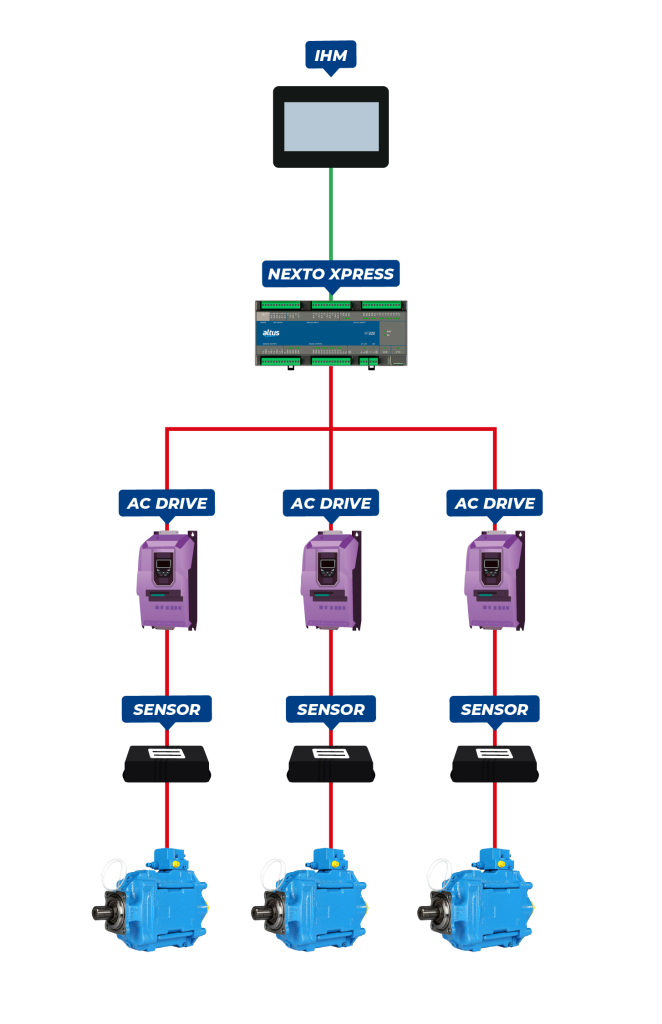 A solução para reduzir o consumo de água e o investimento em manutenção dos motores foi a instalação de um sistema de controle utilizando os controladores compactos da linha Nexto Xpress como peça central. A aplicação desenvolvida conta com um CLP Iot-Ready XP325, uma IHM P2 de 10” e inversores de frequência Altus, além de sensores em todos os pontos sensíveis do processo. Nesta aplicação, os dispositivos são responsáveis por monitorar e alertar sobre o status dos motores (ligado/desligado), a pressão da água e o nível do reservatório.